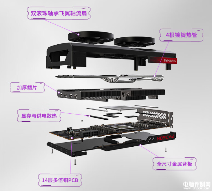 当然和白金版一样,蓝宝RX 7700 XT极地也采用了14层多倍铜PCB,其能有效的应对显卡核心热量,让显卡在长时间高负载下依然稳定运行。同时全尺寸金属背板也可以进一步增强散热,保护PCB不受外力伤害。