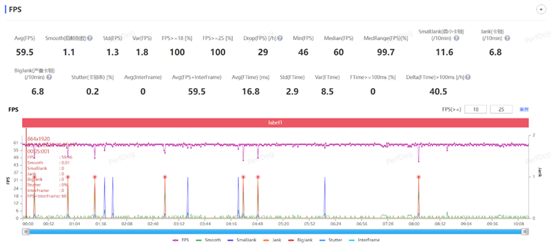 首先是较低负载的王者荣耀手游测试,一局团战近15分钟的测试下来,平均波动仅为0.1,全程帧率稳定在一条直线上,几乎看不到任何波动,游戏过程中非常稳定。
