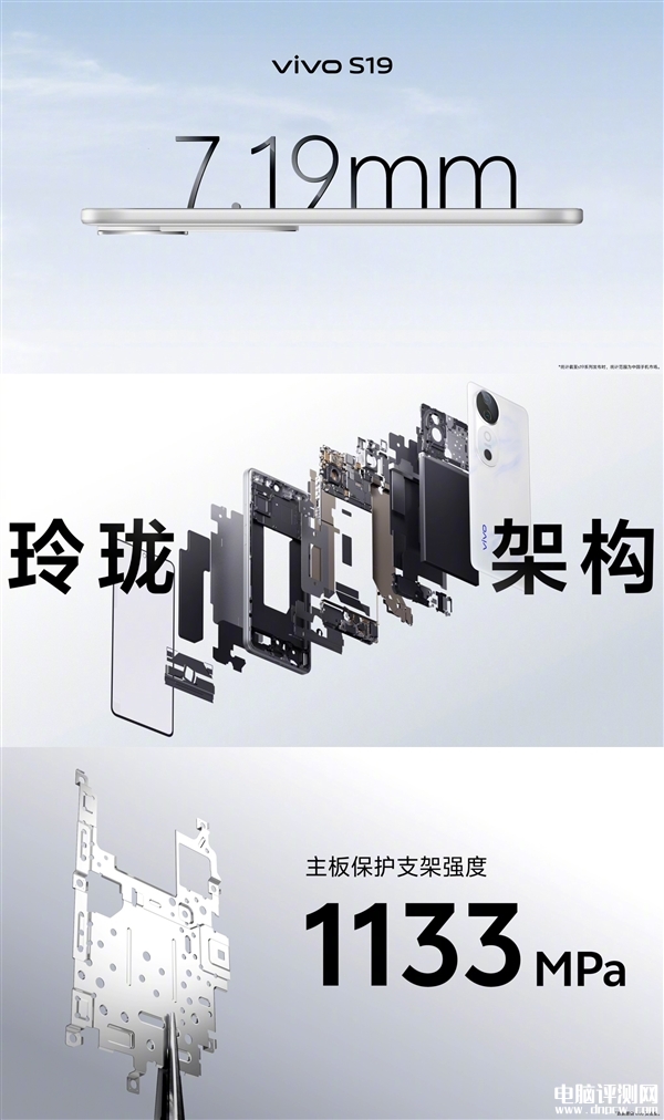 为了实现超薄设计,vivo独创玲珑架构,定制行业最薄的主板支架,采用vivo首创高强低磁钢,厚度减薄至0.15mm,相较行业常规支架用料减薄25%,相较第一代S结构减薄50%。