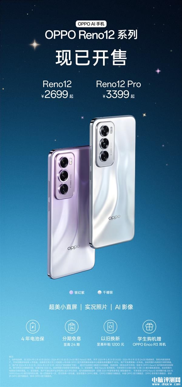 OPPO Reno12系列手机上架开售,Reno 12有千禧银、柔和桃与乌木黑三种配色,Reno 12 Pro则是提供银幻紫、乌木黑、香槟金三款配色,为消费者提供多种选择。