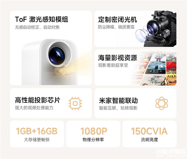 该投影仪还搭载了ToF激光感知模组,支持画面自动矫正、机身位移调整画面、开机无感自动对焦等功能。